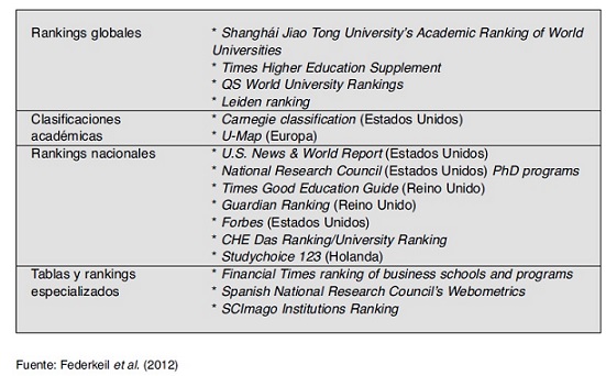 También es posible distinguir entre clasificaciones académicas y clasificaciones parcialmente académicas. Las primeras son listas que clasifican a las universidades e instituciones de educación superior e investigación de acuerdo a una metodología basada en fuentes de datos bibliométricos cuyos criterios son medibles y reproducibles. Las segundas son aquellas clasificaciones basadas en apreciaciones subjetivas propias de las encuestas de opinión y no necesariamente de métodos bibliométricos. En este trabajo adoptaremos la clasificación propuesta por Federkeil y otros autores (2012) para presentar algunos de los principales rankings académicos de universidades.