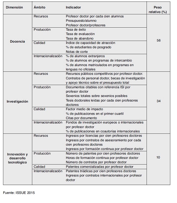 También denominado ISSUE (Indicadores Sintéticos de las Universidades Españolas), este ranking fue creado en 2013 conjuntamente por la Fundación BBVA y el Instituto Valenciano de Investigaciones Económicas (IVIE). 16 Comprende dos rankings generales, uno de volumen de resultados (ISSUE-V) y otro de productividad (ISSUE-P), así como de docencia, investigación, innovación, desarrollo tecnológico y de titulaciones concreta.