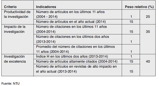 La metodología básica para 2015 es similar a la empleada en 2011-2012, pero se han hecho cambios en algunos indicadores.4 Este ranking excluye de la clasificación a universidades que no enseñan a los estudiantes de grado o que en un período quinquenal han tenido una producción de artículos menor a 1000; es decir, alrededor de 200 al año.