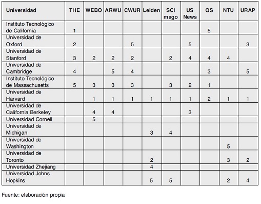 La Universidad de Harvard tiene gran ventaja sobre las demás, ya que aparece primera en ocho de los diez rankings y segunda en otro (QS). Llamativamente, no ocupa ninguno de los cinco primeros puestos en el Times (THE). Otras dos universidades ocupan la primera posición en otros tantos rankings. El Instituto Tecnológico de California es primero en el ranking Times y quinto en el QS. El MIT es primero en el ranking QS, segunda en el U.S. News, tercera en el de Shanghái (ARWU), lo mismo que en el WEBO, CWUR y SCImago. Aparece también quinta en el Times (THE). La Universidad de Stanford está también presente en las primeras cinco posiciones de nueve de los diez rankings. Es cuatro veces segunda (Shanghái, WEBO, CWUR y SCImago), una vez tercera (THE) y tres veces cuarta (U.S. News, QS y NTU) puntúa en cuatro rankings, con posiciones entre tercera, cuarta y quinta.