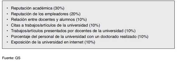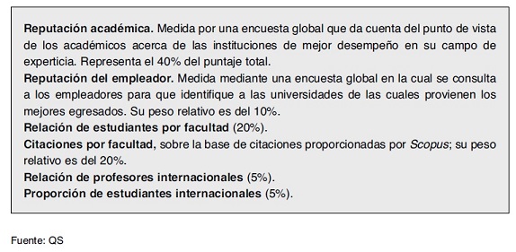 El ranking QS, creado en 2004 en el Reino Unido y publicado de manera individual desde 2010, es el más grande de su tipo, ya que recaba información de 2000 universidades en ciento treinta países. Se basa en seis indicadores de desempeño que evalúan a las universidades en cuatro áreas: investigación, enseñanza, empleabilidad e internacionalización. 5Cada uno de los seis indicadores lleva una ponderación diferente en el cálculo de las puntuaciones globales. Si bien cuatro de los seis indicadores se basan en los datos “duros”, la mayor parte del puntaje (60%) se asigna en base a la “reputación” académica y la de los empleadores de los egresados, en ambos casos sobre la base de encuestas globales. Para los indicadores basados en datos duros, el ranking QS utiliza alguna información proporcionada por las propias universidades y datos bibliométricos de la base de datos Scopus.