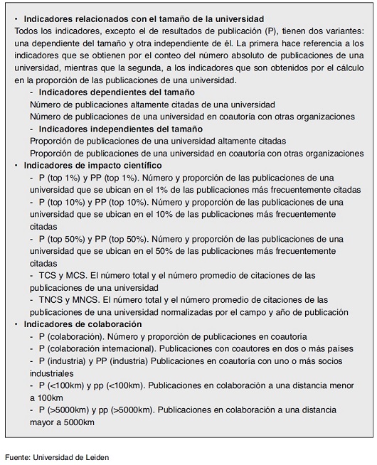 El Centro de estudios de Ciencia y Tecnología de la Universidad de Leiden (CWTS), en Holanda, publica desde 2008 el Ranking de Leiden, que clasifica 750 universidades en todo el mundo de acuerdo a la producción de publicaciones en revistas científicas internacionales en determinados periodos. 6La clasificación está basada en información de la base de datos de la Web of Science. Sólo artículos de investigación y artículos de revisión son tomados en cuenta. Las publicaciones en colaboración son contadas fraccionadamente.
