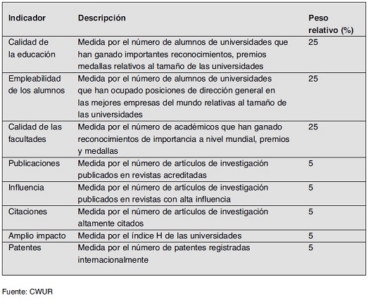 El Center for World University Rankings (CWUR) mide desde 2012 la calidad de la educación y la formación de estudiantes al igual que el prestigio de los miembros de las facultades y la calidad de sus investigaciones sin depender de encuestas y datos suministrados por las universidades. 8 El CWUR usa ocho objetivos e indicadores para clasificar las principales mil universidades a nivel mundial.