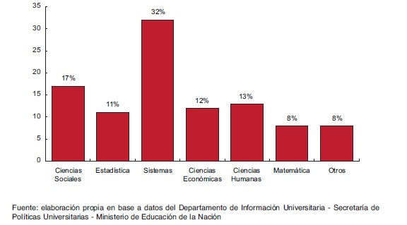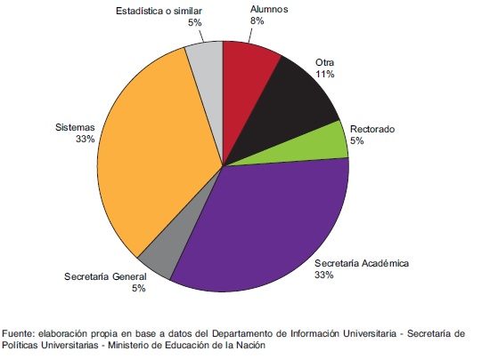 A su vez, las áreas dentro de la institución en que se desempeñan los responsables de la información son mayoritariamente sistemas (38%) y rectorado (18%), mientras que sólo el 11% lo hacen en áreas estadísticas, 9% en secretarías académicas y el 7% en secretarías generales.