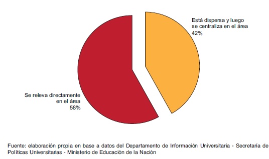 Otro de los aspectos incluidos en el relevamiento tuvo que ver con indagar acerca de la centralización o no de la información estadística dentro de las instituciones. Los datos muestran que en el 42% de las instituciones la información está dispersa en distintas unidades académicas (departamentos, áreas, facultades) y que luego se centraliza.