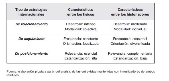 El cuadro a continuación expone sintéticamente las diferencias identificadas entre las estrategias internacionales desarrolladas por los físicos y los historiadores de los dos institutos, respectivamente.