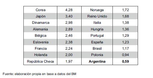 Para comparar la situación de Argentina con la de los países de la OCDE fue necesario recurrir a distintas fuentes de información. Para estos últimos, el indicador de intensidad en I+D se construyó en base a la información de gasto en I+D por sector industrial para 2012, en la moneda del país de origen, de la Analytical Business Enterprise Research and Development Database (ANBERD) de la OCDE. A su vez, dicha variable fue dividida por el VA según sector industrial (mismo año y moneda), disponible en la Structural Analysis Database (STAN) de la OCDE. Para el caso argentino, se trabajó con los micro-datos para 2012 de la Encuesta Nacional del Empleo y la Innovación (ENDEI), elaborada conjuntamente por el ex MINCyT y el ex MTEySS.