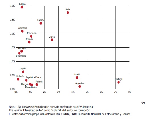 Es posible detectar que no existe una relación unívoca entre ambas variables para los países de la muestra, sino diferentes combinaciones que configuran perfiles particulares. En Portugal, Argentina, Brasil e Italia, la industria de confección de indumentaria tiene un peso significativo en la estructura industrial, aunque sólo en Italia la I+D juega un rol destacado. Mención aparte merecen Corea y España, que también poseen industrias de ropa de perfil innovador y de importancia no despreciable (en torno al 2% del VA industrial).