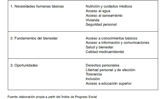 Si tomamos al individuo como centro de interés de la investigación y de la acción política, debemos tomar el Índice de Desarrollo Humano y el Índice de Progreso Social como indicadores de referencia. En la presente contribución, y con el objetivo de establecer una imagen fija del bienestar de los ciudadanos iberoamericanos, nos centraremos en el Índice de Progreso Social debido a que los indicadores son exclusivamente sociales y ambientales y analizan resultados reales asumiendo una visión holística e integral. Todos los datos que se utilizan para evaluar cada uno de los 128 países proceden de fuentes oficiales (por ejemplo: la Organización de las Naciones Unidas) y se organizan en tres grandes bloques: necesidades humanas básicas, fundamentos de bienestar y oportunidades. En la siguiente tabla se muestran cada uno de los aspectos que constituyen cada bloque.