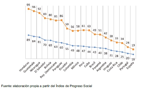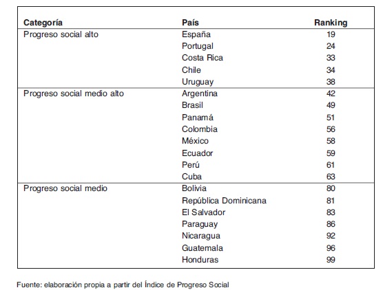 Podemos confirmar que ha habido un retroceso general en los países iberoamericanos en relación al progreso social y, por tanto, en materia de bienestar ciudadano. Los países que menos han descendido son España (-3 posiciones) y Portugal (-4 posiciones), Argentina (-4 posiciones) y Ecuador (-4 posiciones). El país más afectado ha sido Paraguay (-26 posiciones), seguido de Cuba (-19 posiciones) y República Dominicana (-18 posiciones). El resto de los países iberoamericanos ha descendido entre cinco y catorce posiciones. Según la clasificación final, de todos los países iberoamericanos podemos concluir que cinco Estados se encuentran entre los países de progreso social alto, ocho en progreso social medio alto y siete en progreso social medio. La siguiente tabla ilustra la posición de cada uno de los países.