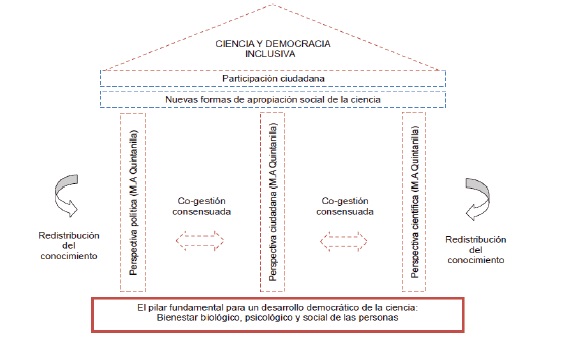 ¿Cómo podemos conocer el funcionamiento de una ciencia y una democracia inclusiva? Tal y como indica Chomsky (2016: 145), “una forma de valorar el funcionamiento de la democracia es, pues, la medida en la que la teoría se aproxima a la realidad y en que los electorados nacionales se aproximan a coincidir con la población”. Mediante la siguiente figura se relaciona la cultura cívica y la cultura científica, considerando la participación de la ciudadanía como el eje fundamental de cualquier sistema democrático y el bienestar biológico, psicológico y social del ciudadano como pilar fundamental. La ausencia de la “salud ciudadana” dificultaría cualquier proceso para impulsar un desarrollo democrático de la ciencia y de la democracia.