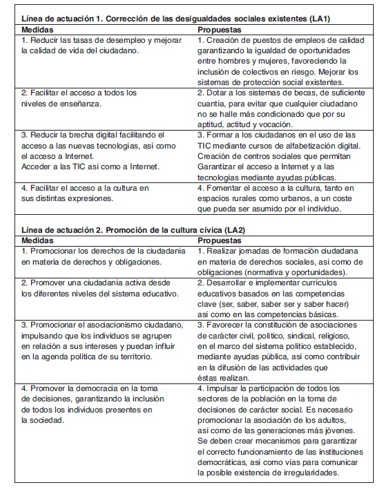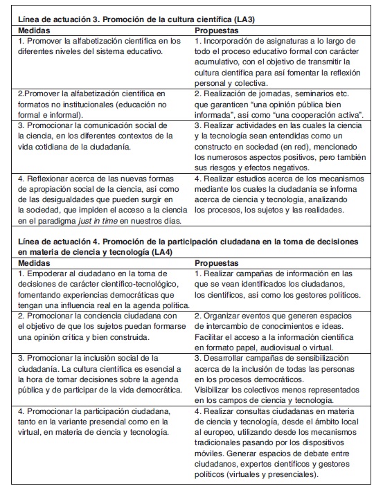 Con el objetivo de establecer vías plausibles de mejora social establecemos cuatro líneas de actuación estratégicas, incorporando 16 medidas concretas que deben ser llevadas a cabo para fomentar la participación ciudadana en materia de ciencia y tecnología en todos los países iberoamericanos. Las cuatro líneas estratégicas deben aplicarse en paralelo poniendo como epicentro de la agenda política a las personas menos favorecidas de nuestras sociedades. Cada línea estratégica está conformada por cuatro medidas que se materializan en propuestas de acción social.