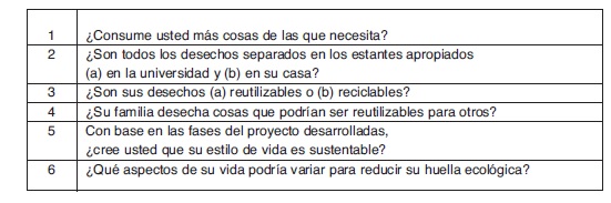 • Recolección y análisis de los datos. En esta fase los estudiantes establecieron, de forma individual, su patrón de consumo mediante el diligenciamiento de una planilla que recogió los datos sobre los productos consumidos y los desechos generados en tres momentos del día (mañana, tarde, noche) a lo largo de una semana, con base en esta información contestaron las preguntas mostradas en laTabla 1.