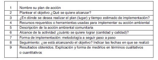 García y Vega (2009) expresan que la educación ambiental a favor del desarrollo sostenible debe proporcionar tres tipos de saberes: un “saber hacer”, un “saber ser” sensible y consciente frente a la urgente necesidad de una sociedad sostenible y un “saber actuar” a través de acciones responsables y eficaces que favorezcan el desarrollo sostenible, este saber es el más olvidado por los maestros, pero se puede operativizar mediante estrategias didácticas de carácter constructivista. Desde el primer semestre de 2017 y bajo la recomendación de los estudiantes de semestres anteriores, la experiencia asociada al cálculo de la huella ecológica se desarrolló, en cinco fases, iniciando con la presentación del tema, la introducción a los conceptos básicos, la recolección y análisis de datos, el planteamiento y ejecución del plan de acción y la elaboración final de un informe. La etapa plan de acción fue incorporada con el objetivo de reforzar el componente de la educación ambiental denominado comportamiento ambiental responsable el cual propende por la participación activa y focalizada a la solución de un problema. El cuadro de plan de acción utilizado contempló los elementos mostrados en la Tabla 2.