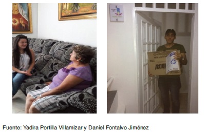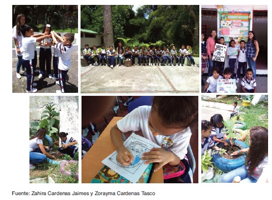 El 11% efectuó acciones como recolección de residuos inorgánicos en zonas verdes y se resalta el trabajo de las estudiantes de primer semestre de ingeniería industrial Zahira Cardenas Jaimes y Zorayma Cardenas Tasco, quienes planearon, elaboraron material y desarrollaron una campaña sobre conservación y protección del ambiente y los recursos naturales con los niños de tercero primaria del colegio Carlos Vicente Rey —Sede C— de Piedecuesta. Durante la semana en que socializaron con los niños realizaron, además, actividades enfocadas al eco-arte, ejercicios de separación apropiada de los residuos sólidos y una campaña de limpieza y cuidado de las zonas verdes (Figura 3). En la explicación de los resultados de su plan de acción, ambas estudiantes expresaron: