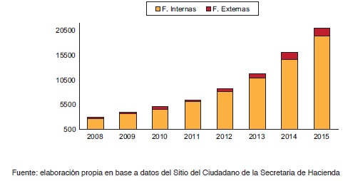 Entre 2008 y 2015 se observa un fuerte crecimiento del presupuesto de ciencia y técnica sostenido por el incremento constante de las partidas presupuestarias del Tesoro nacional. Dicho crecimiento se explica por el desempeño positivo del sistema de recaudación impositiva en un contexto de crecimiento económico, lo que permitió una mayor disponibilidad de fondos para ser destinados al desarrollo del sistema de CTI. En este marco, el ex MINCyT consolidó su posición al interior del sistema al absorber entre el 12% y el 16% del presupuesto total del sector. Dicha participación se explica principalmente por las acciones desarrolladas por la ANPCyT en la función de “promoción y financiamiento de la ciencia y la tecnología”. Por otraparte, la utilización de fuentes externas se concentra esencialmente en la ANPCyT, cuya incidencia sobre el total del sistema es relativamente baja, aunque no así en la composición presupuestaria del ex MINCyT (Gráficos 1 y 2). En consecuencia, los cambios introducidos en materia de generación de nuevas fuentes de financiamiento se concentran en el funcionamiento de la ANPCyT.