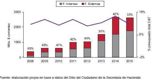 En este sentido, los presupuestos asignados a la función ciencia y técnica han estado fuertemente influenciados por los ciclos macroeconómicos, registrando etapas de expansión y de contracción coincidentes con los ciclos de recesión y crecimiento económico. Al estar supeditada la disponibilidad de fondos a las prioridades de las políticas macroeconómicas, que en líneas generales no han considerado —salvo breves períodos— la promoción de la CTI como un factor clave de las estrategias de desarrollo del país, o más recientemente, de las estrategias de crecimiento y competitividad, implica que en las situaciones de crisis dichas funciones son relegadas por no ser percibidas como estratégicas o no estar claramente incluidas en políticas de largo plazo. En consecuencia, los vaivenes presupuestarios han minado la sostenibilidad de las políticas de CTI (Mosto, 2011; Rivas, Rovira y Scotto, 2014). En otros términos, si bien las fuentes financieras utilizadas para conformar los presupuestos nacionales son diversas, al ser la fuente más importante los ingresos corrientes de origen tributario, la disponibilidad de recursos depende, entre otros factores, de la evolución de la recaudación impositiva y estructura tributaria, y derivado de ello, de la implementación de políticas de control del déficit de las cuentas públicas, medidas que tienden a desfinanciar o reducir recursos en aquellas áreas de la agenda pública no consideradas prioritarias o estratégicas en el mediano y largo plazo, como se mencionó anteriormente.