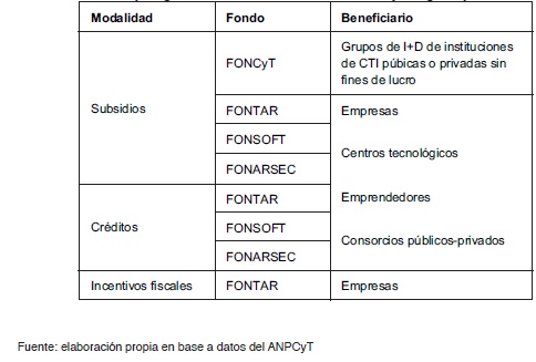 Con excepción del FONCyT, el resto de los fondos de la ANPCyT están explícitamente dirigidos al sector productivo. Mientras que los instrumentos del FONTAR constituyen fundamentalmente herramientas de intervención horizontal, los del FONSOFT y el FONARSEC son de carácter sectorial y selectivo. Por otro lado, el FONTAR y el FONSOFT tienen un claro sesgo hacia el segmento de firmas PyMEs mediante criterios selectivos en la asignación de los recursos (Tabla 1).