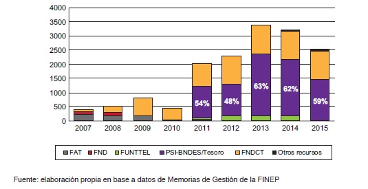 Uno de los mecanismos adoptados para incrementar el volumen de recursos disponibles ha sido la creación de fondos basados en recaudación tributaria de afectación específica. Este tipo de fondos permite incrementar la disponibilidad de recursos presupuestarios y protegerlos para que no sean afectados a otros fines para los cuales fueron creados. Sin embargo, al mismo tiempo introduce rigideces presupuestarias al impedir reorientar recursos en caso de necesidad. En Argentina este mecanismo fue eliminado en 1991 al instaurarse el régimen de convertibilidad. Esto afectó la implementación de la Ley 23.877 que contemplaba la creación de un fondo de promoción que debía componerse de recursos que surgirían de la transferencia del 1% del impuesto al cambio de divisas y el recupero de operaciones crediticias, obligando a modificar la operatoria de la Ley al incorporar como fuente de recursos los provenientes de rentas generales (Del Bello, 2014: 41) y operaciones de crédito externo con el BID y el BIRF. En el caso de Brasil, a pesar de las modificaciones introducidas en el sistema presupuestario, el financiamiento a través de fondos de afectación específica se mantiene vigente. De esta forma, a partir de la década del 80 del siglo pasado se fue ampliando el número de fondos a los cuales recurre la FINEP como aportes de capital para sostener sus operaciones, en particular sus líneas crediticias a tasas subsidiadas: el Fondo Nacional de Desarrollo (FND) y el Programa de Inversión Sustentable (PSI), ambos a cargo del Banco Nacional de Desarrollo Económico y Social (BNDES) y el Fondo de Amparo a los Trabajadores (FAT) del Ministerio de Trabajo.6