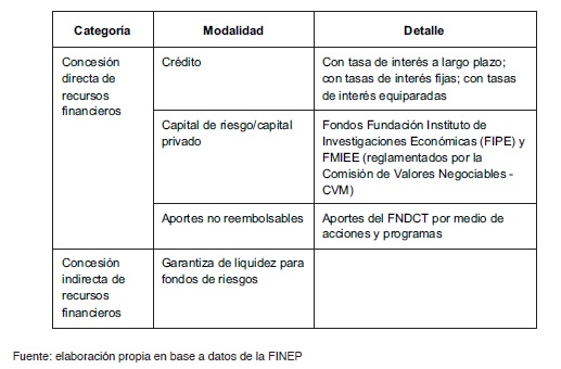 La principal línea de crédito de la FINEP es el Programa Innova Brasil, a través del cual se ofrece financiamiento a tasas inferiores a las del mercado tomando como referencia la tasa de interés a largo plazo. El fondeo del programa surge de recursos del FNDCT, del FAT y recursos propios derivados de los resultados de sus aplicaciones financieras. Si bien opera en la práctica como un banco de primer piso, al no serlo en términos estatutarios no dispone de recursos propios —más allá de los resultados de sus aplicaciones financieras— para lo cual debe recurrir a fuentes adicionales tal es el caso de los préstamos del BNDES (del programa PSI). Esto significa que la FINEP presenta dificultades para sostener en el tiempo sus diversas líneas de crédito, lo que deriva en la discontinuidad de diversos programas, como por ejemplo la línea de crédito “Juro Zero” (tasa cero), creada en 2005 para atender las demandas crediticias del segmento de empresas PyMEs.