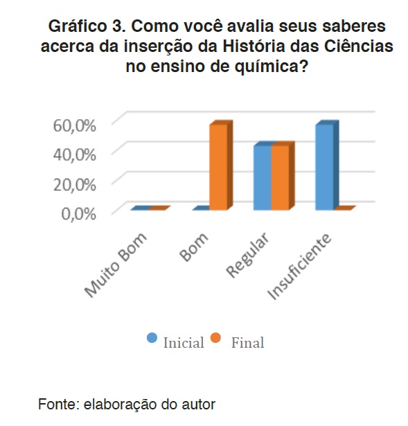 As questões 3 e 4 versaram sobre seus saberes e aptidões para a realização da inserção da HC no ensino de química: “3) Como você avalia seus saberes acerca da inserção da História das Ciências no Ensino de Química? e 4) Como você avalia sua aptidão para abordar a História das Ciências em sala de aula?”. Podemos observar que a maioria dos cursistas consideravam conhecer pouco sobre HC (43% Regular e 57% Insuficiente) e, consequentemente, terem pouca aptidão para abordarem tais temas com seus alunos (71% Regular e 14% Insuficiente). Este cenário foi se alterando, gradativamente, durante as discussões nos fóruns online e nas atividades presenciais, de forma que na avaliação final a maioria dos cursistas já se sentiam um pouco mais à vontade para tratarem do tema, como podemos observar nos Gráficos 3 e 4que comparam as respostas apresentadas nos questionários (QI e QF).