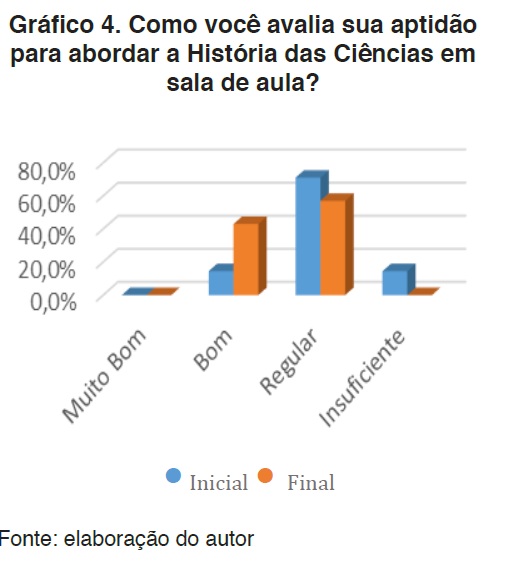 Percebemos que ao final da Oficina os professores mudaram suas percepções sobre o potencial de utilização da HC em sala de aula e da mesma forma passaram a se considerarem aptos, ou no caminho certo para inserirem a HC em suas aulas. Esta percepção está expressa, não somente nos dados acima apresentados, mas também nos trechos extraídos de suas falas durante o curso. Esta percepção corrobora a relevância dos cursos de formação continuada para o incremento da prática pedagógica e teórica dos professores.
