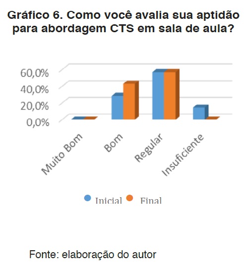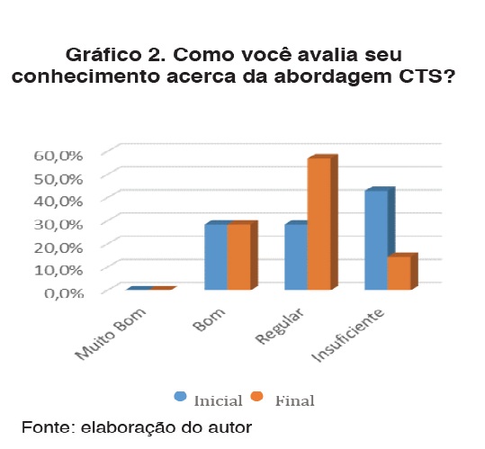 Estes dados não apresentaram uma mudança significativa ao final do curso, pois ainda temos, no questionário final 71,5% considerando seus conhecimentos insatisfatórios ou regulares, conformeGráfico 1. Já em relação à abordagem CTS, relativa a questão 2 (Gráfico 2), inicialmente tivemos 28,5% dos cursistas considerando seu conhecimento como muito bom, 57% regular e 14,5% como insuficiente e, ao final do curso observamos uma mudança significativa, pois nenhum professor considerou seus conhecimentos como insuficientes, contr 23% regular e 57% Bom ou muito bom
