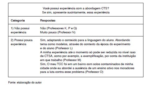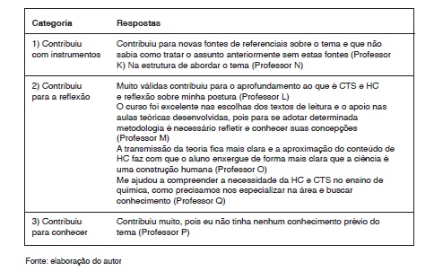 Esta compreensão da necessidade de ampliação do conhecimento antes do recorte didático foi uma reflexão muito importante da oficina, pois, inicialmente os professores tinham uma concepção de HC exclusivamente episódica, ilustrativa e centrada nos grandes gênios da ciência, e a educação CTS como contextualização e exemplificação através de experimentos. Esta perspectiva pode ser observada nas respostas apresentadas às questões 2 e 3, categorizadas nos Quadros 6 e 7.