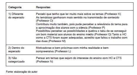 Já em relação a segunda categoria, dois professores afirmaram ter buscado o curso para aprimorarem seus conhecimentos, refletirem sobre suas práticas e construírem materiais para utilizarem com os alunos, já que é difícil encontrar material didático apropriado para a discussão da HC e da CTS em sala de aula.