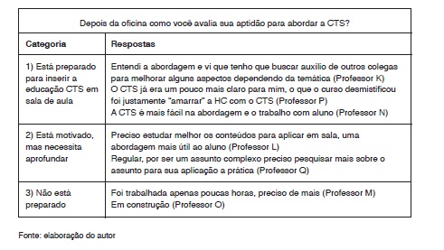 Estes dados nos revelam que a oficina possibilitou uma percepção sobre seus conhecimentos em HC e CTS, mas que ainda há um caminho a ser percorrido pelos professores. A formação continuada apresenta-se como uma ação relevante no incremento aos saberes docentes, entretanto, faz-se necessária a ampliação desta formação para que os professores sintam-se habilitados à discussão HC/CTS.