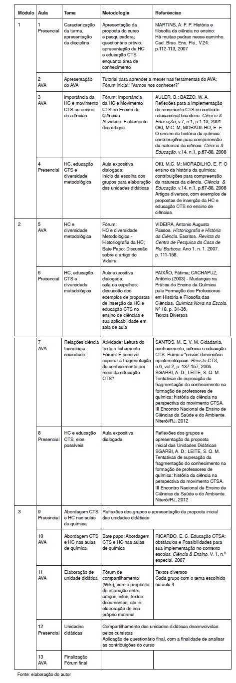 Durante as falas dos professores e nos fóruns online, não houve menção a nenhum tema específico, apontando para a dificuldade apresentada pelos cursistas em relacionarem os conteúdos de química com a HC e a educação CTS, como apontado por diversos pesquisadores (Lima e Nuñes, 2011; Niaz, 2009; Oki e Moradillo, 2008; Dias, et al., 2002; Spillane, 2013).