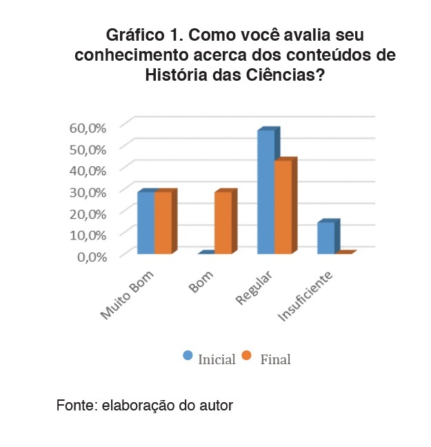 Os questionários apresentaram 8 questões objetivas e 4 discursivas, relacionadas diretamente às concepções individuais sobre História das Ciências e a educação CTS. Neste momento, iremos analisar as questões objetivas do QI em comparação com o QF. A primeira questão relacionava-se aos conhecimentos prévios sobre HC, “Como você avalia seu conhecimento acerca dos conteúdos de História das Ciências?”. Na reposta a esta questão, 28,5% consideravam possuir um bom conhecimento sobre o assunto contra 43% que os definiram como regulares, sendo que apenas 28,5% definiram como insuficientes seus conhecimentos sobre os conteúdos de HC.