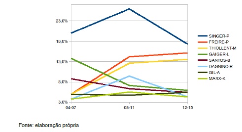No que diz respeito aos autores mais referenciados, o gráfico abaixo fornece a lista dos oito primeiros: Paul Singer, Paulo Freire, Michel Thiollent, Luís Inácio Gaiger, Boaventura de Sousa Santos, Renato Dagnino, Antônio Carlos Gil e Karl Marx. Para facilitar a visualização, os trabalhos estão agrupados de três em três anos. O valor numérico se refere ao percentual de artigos, naquele triênio, que cita ao menos uma vez o respectivo autor em sua bibliografia.