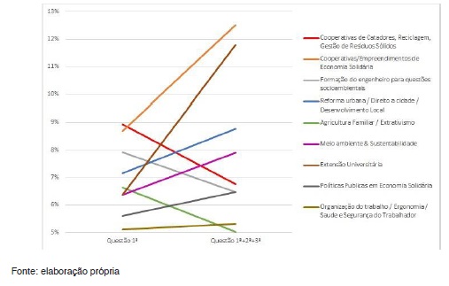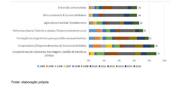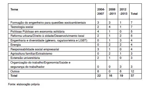 Nota-se, assim, uma clara predominância, nas publicações apresentadas nos ENEDS e nas atividades desenvolvidas ao longo de cada edição do encontro, de autores, ideias/palavras-chave e/ou temáticas relacionadas ou aplicáveis à problemática de extensão, economia solidária e/ou tecnologia social. Merece destaque também o tema da formação em engenharia, que é bastante recorrente nos eventos e nas preocupações dos estudantes da área.