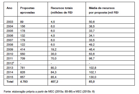 Observa-se um significativo aumento de recursos para o programa a partir de 2009. Trata-se, como salienta Maciel (2010), do resultado da articulação política, uma vez que, nesse ano, começam a ser lançados os editais em conjunto com outros ministérios. Além disso, destaca-se a evolução da média de recursos por proposta aceita, o que indica que houve aumento tanto do número de propostas quanto dos recursos disponibilizados para cada uma delas.