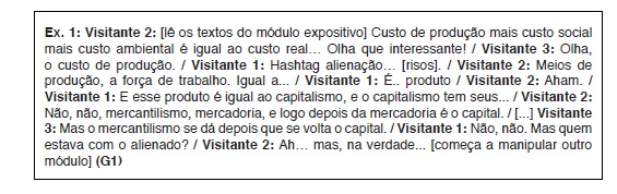 Para ilustrar como a dimensão “compreensão de assuntos sociocientíficos” ocorreu ao longo das visitas, trazemos o exemplo do G1 em que surgiu uma conversação entre os próprios visitantes, a partir da contemplação do módulo “O custo real de suas coisas”. Nesse momento, três jovens contemplam e leem o diagrama explicativo exposto, e discutem o seu conteúdo associando-o a seus conhecimentos prévios. Eles mencionam, buscam a validação com a opinião dos colegas e negociam e retificam conceitos e entendimentos sobre “custo de produção”, “força de trabalho”, “produto”, “mercadoria”, “capital”, “capitalismo”, em busca de uma compreensão sobre como essas questões influenciam o custo real das coisas e objetos do cotidiano.