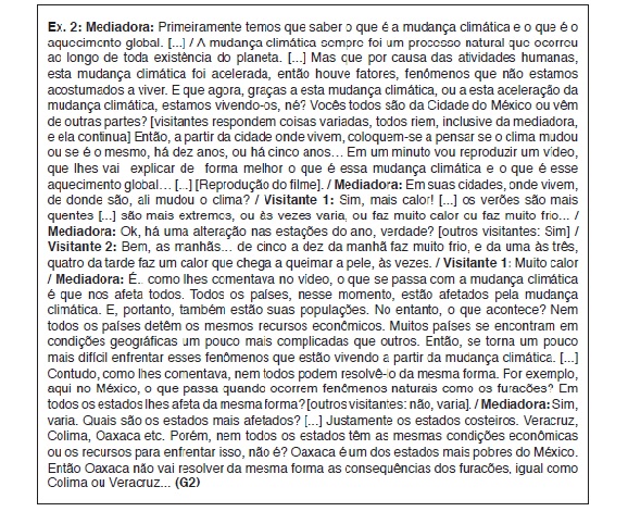 O exemplo a seguir traz a primeira parte dessa atividade que contribui para a compreensão assuntos sociocientíficos, mesmo que ainda que muito focada na fala da mediadora e no vídeo proposto durante o Fórum. Pode-se observar que a mediadora apresenta a questão do aquecimento global, através de uma contextualização do processo e da aproximação com a realidade dos visitantes, ao propor uma reflexão da problemática dentro do seu âmbito de experiência: as mudanças climáticas observadas nos últimos anos na sua própria cidade e dos fenômenos naturais que têm acontecido no México e afetado os estados da costa do país.