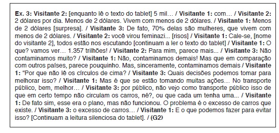 O exemplo acima levanta algumas reflexões sobre como os visitantes formulam suas visões próprias, e, especialmente, como elas podem ir se modificando após o debate com os colegas. Ao retomarmos a fala inicial do visitante 1, quando ainda discutiam entre si os textos do tablet (Ex. 3), observa-se como, depois da discordância da colega, há uma mudança em seu ponto de vista. Se antes ele defendia as políticas públicas empreendidas (“Mas é que estão tomando muitas ações… No transporte público, bem, melhor…”), após a intervenção da Visitante 3, nota-se uma ligeira mudança: “De fato sim, esse era o plano, mas não funcionou. O problema é o excesso de carros que existe”. A reflexão da colega leva o adolescente a repensar a efetividade das medidas tomadas pelos órgãos públicos e admitir que as medidas não funcionaram.