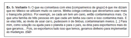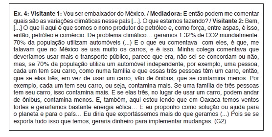Já na continuação da discussão, durante a exposição para todos os visitantes e a mediadora (Ex. 4), é possível perceber a importância dada pelo visitante 1 à opinião da colega que o levou a reformular sua visão própria sobre a questão do transporte público, ao utilizar mais da metade do seu tempo de fala para discorrer sobre o tema. Em sua fala, o visitante 1 começa reticente: credita a autoria da reflexão à colega, está incerto quanto à concordância dos demais... (“Minha colega comentava que deveríamos usar mais o transporte público, parece que era, não sei se concordam ou não, mas, se 70% da população utiliza um automóvel independente, (...) no lugar de usar um carro, podem andar de ônibus, contamina menos”), porém, após essa apresentação, ele desenvolve todo um contexto inclusive incluindo dados (70% da população, uma família de três membros...) que não haviam sido ditos nem discutidos previamente com o grupo, revelando se tratar mais de um ponto de vista próprio dele do que o que a outra colega havia dito. Ou seja, seu ponto de vista não apenas foi alterado com o debate com os colegas; ele foi aprofundado e refinado.