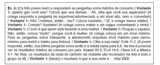 Observamos que a tomada de decisões, baseada em informações fornecidas pelo museu e pelas opiniões e experiências prévias dos visitantes adolescentes aconteceu não somente no Fórum, mas também durante a interação com os módulos expositivos nos demais ambientes do MIDE, como podemos identificar no exemplo a seguir, do G3: