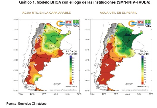 El intercambio entre expertos sectoriales brinda un contexto para compartir avances que se realizan en modelos, metodologías innovadoras y pronósticos de carácter sectorial o regional, permitiendo el ajuste de estos productos con las sugerencias y aportes grupales. Así se sientan las bases para colaboraciones interinstitucionales e interdisciplinarias y se evita la superposición de productos o información que no sólo duplica el trabajo, sino también puede discernir en sus resultados o en el formato de la presentación, generando confusiones entre aquellos que consultan los productos en las páginas web institucionales. Un ejemplo del proceso de integración formal es lo sucedido con el Modelo de Balance Hídrico Operativo para el Agro (BHOA).9 Este producto fue desarrollado por la Cátedra de Climatología y Fenología Agrícola de la Facultad de Agronomía de la Universidad de Buenos Aires (FAUBA). En sus inicios era elaborado y corrido por FAUBA y en forma paralela por el SMN, utilizando los datos provistos por las estaciones de observación del SMN. La identificación por parte de las instituciones de la superposición del producto y la respectiva duplicación de trabajo hizo que se generen acuerdos de cooperación formales entre FAUBA, INTA y SMN para presentar el BHOA de forma conjunta, lo que puede verificarse actualmente en el mapa inscripto con los tres logos consecutivos (Gráfico 1). ).