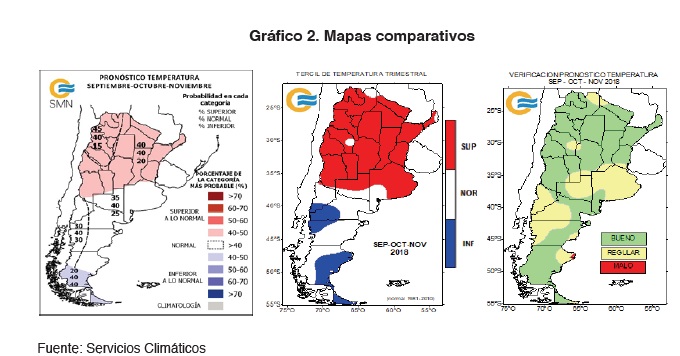 La segunda parte de la reunión comienza con la verificación del pronóstico trimestral emitido el mes anterior, para las variables de temperatura media y precipitación (Grafico 2). Se presentan tres mapas que permiten comparar: 1) el pronóstico emitido para el país en la modalidad de terciles (asignación de probabilidades de ocurrencia); 2) lo observado; y 3) la verificación del pronóstico en tres categorías: bueno, regular, malo, según su grado de acierto (Stella y Skansi, 2018). A primera vista, las imágenes permiten identificar la performance del pronóstico, en qué regiones se acertó o no. La información de la primera parte de la reunión sienta las bases para fundamentar los fallidos que tuvo el pronóstico o la satisfacción por el acierto y se comentan aquellas situaciones meteorológicas significativas dentro del trimestre que llevaron a este resultado.