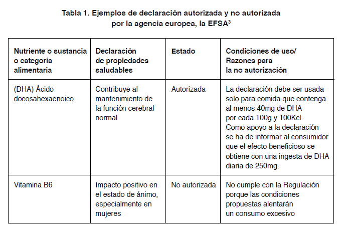 Según ambas normativas, una vez que, por un lado, queda claro que la declaración es relativa a un beneficio concreto para un grupo poblacional claramente definido y que, por otro lado, está substanciada en evidencia científica, 2. se procede a la evaluación de la redacción de la declaración misma. A este respecto, la propia declaración no solo ha de ser suficientemente comprensible, sino que también ha de ir acompañada de indicaciones de consumo inteligibles, para el logro óptimo o no perjudicial del supuesto beneficio. Véase el ejemplo europeo en Tabla 1. 3