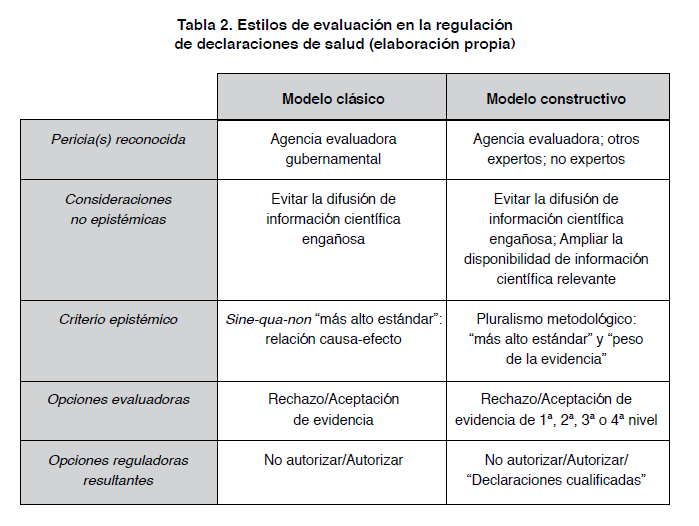 La regulación estadounidense habría transitado desde una evaluación clásica a una más constructiva a causa de su reconocimiento de más valores tanto epistémicos como no epistémicos. Por un lado, reconoció la complejidad metodológica de las ciencias de la nutrición y que la sustanciación científica según otras metodologías típicas también puede constituir información relevante tanto para una evaluación positiva de las declaraciones como para ser comunicada a los consumidores. Asimismo, amplió los derechos civiles de informar libremente, por parte de los productores de alimentos, y de elección informada, por parte del consumidor. En la consecuente comunicación de información técnica a través del etiquetado no solo nos encontramos, entonces, la declaración de salud, sino también una aclaración sobre el estándar de evidencia por el que el consumidor ha de juzgarla. Todo ello ha resultado en un proceso evaluador más participativo y una regulación menos paternalista que la europea, características estas que responderían a condiciones más adecuadas para una significativa apropiación social de conocimiento según ciertos preceptos defendidos desde la perspectiva CTS.