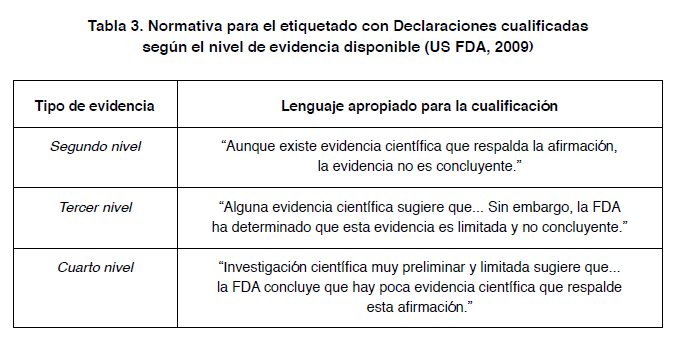 Aunque el presente caso de estudio es una instancia concreta de evaluación y regulación de beneficios, tanto la comunicación europea como la estadounidense buscarían, al menos, lograr los mismos objetivos señalados por López Cerezo. En general, quieren dar a conocer la información científica más fiable disponible sobre Tipo de evidencia Lenguaje apropiado para la cualificación Segundo nivel “Aunque existe evidencia científica que respalda la afirmación, la evidencia no es concluyente.” Tercer nivel “Alguna evidencia científica sugiere que... Sin embargo, la FDA ha determinado que esta evidencia es limitada y no concluyente.” Cuarto nivel “Investigación científica muy preliminar y limitada sugiere que... la FDA concluye que hay poca evidencia científica que respalde esta afirmación.” los beneficios asociados a ciertos alimentos. Ambas regulaciones pretenden generar confianza en la ciudadanía a través de hacer también públicamente disponibles los aspectos procedimentales y decisorios de los expertos y de las autoridades reguladoras al respecto, así como parecen suponer que todo ello generará una actitud positiva, también, hacia las instituciones como fuente acreditadora de la veracidad del contenido de las declaraciones. Además, se espera que tales conocimientos conducirán a los consumidores a seguir una dieta más saludable con el consumo de este tipo de alimentación, lo que finalmente mejorará la salud pública.