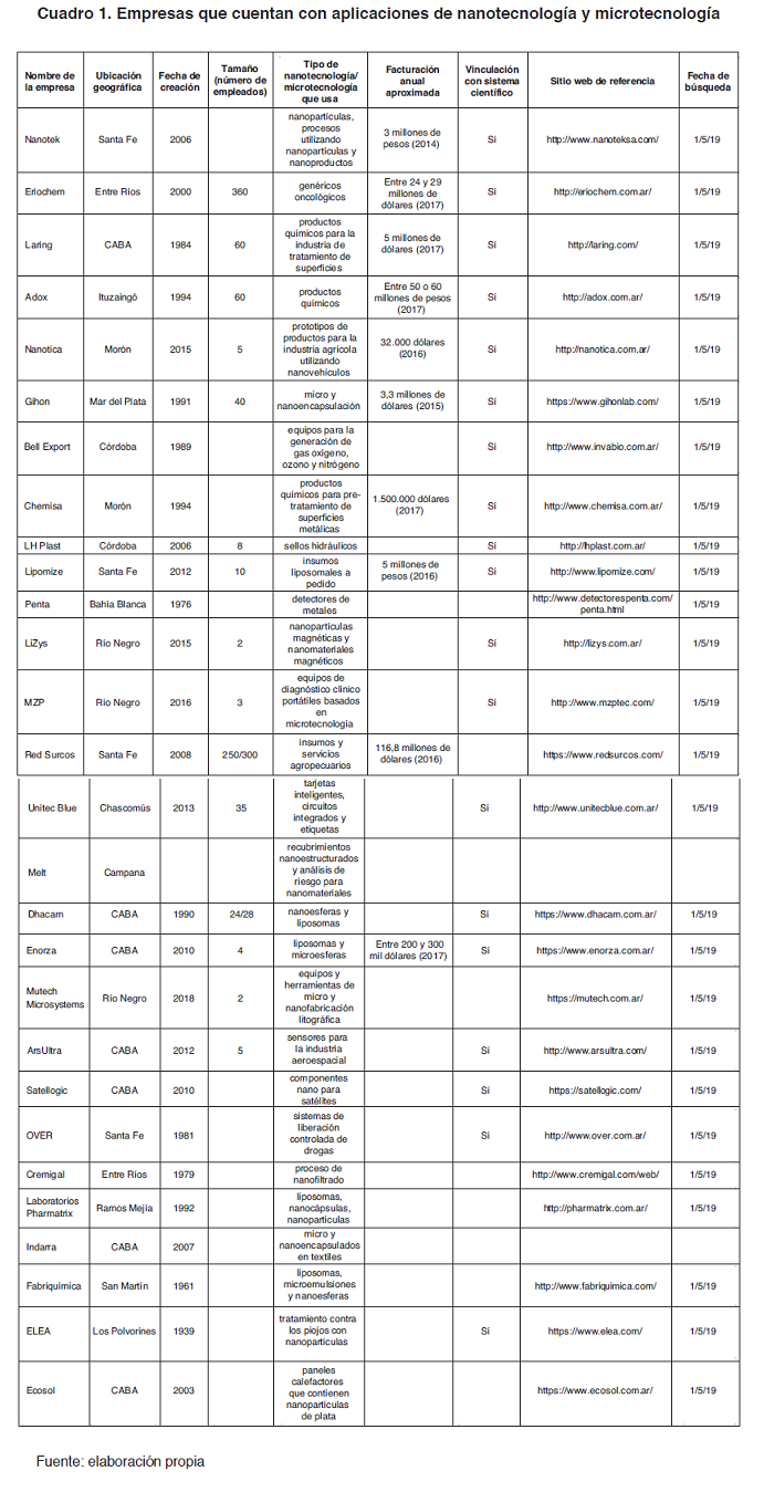 Según algunos artículos periodísticos de 2013, las empresas argentinas involucradas en actividades relacionadas con la micro y nanotecnología hacia 2015 se proyectaban en 400. Por ejemplo, Águeda Menvielle, que fue directora de relaciones internacionales del MINCyT (1998-2016) y tuvo a su cargo el programa Nanopymes, sostenía por aquel entonces: “El sector, en 2015, abarcará a 400 pymes en todo el país (hoy son más de 30, según el boletín de la Fundación Argentina de Nanotecnología, FAN) y empleará, en forma directa, a 11.000 personas” (El Cronista, 2013). Contrariamente a lo que ahí se sostenía, según este trabajo existen en el país 54 empresas vinculadas con actividades nanotecnológicas, de las cuales 28 cuentan con productos a base de nanotecnología disponibles en el mercado.