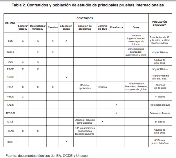 En la siguiente tabla se muestran los contenidos abordados en estas pruebas y las poblaciones que han sido el foco de las evaluaciones.