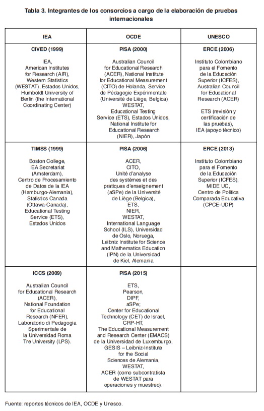 Las pruebas internacionales pioneras diseñadas por la IEA en los años 1960 contaron con el apoyo de Unesco y la Ford Foundation, estableciendo vínculos más bien formales con los gobiernos. La modalidad de elaboración de pruebas que se generaliza desde los años 1990 incluye la participación no solo financiera de los gobiernos, sino también sustantiva, a través de una continua colaboración técnica entre los expertos de los organismos internacionales y de los países. Varios organismos internacionales desarrollaron iniciativas en materia de evaluaciones internacionales. No obstante, desde los años 1990, los organismos dominantes son tres: OCDE, IEA y Unesco.4