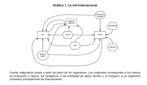 El objetivo aquí es discernir algunos elementos centrales de esa red productiva que sustenta y provee la infraestructura de estas pruebas, y luego explorar esa labor “productiva”. Dado el carácter internacional del ensamblaje y dada la complejidad del tejido, que incluye variado tipo de entidades, lo que se puede mostrar en estas breves páginas es solo una versión estilizada de las conexiones, dejando fuera varias de ellas. Lo que se busca aquí es visualizar el cuadro general que se oculta tras la proliferación de información circulante.