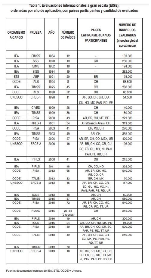 Las EIGE tienen una historia que comienza con los tempranos esfuerzos de la IEI en la década de 1930, que se ven detenidos por la Segunda Guerra Mundial. Se reactivan en los años 1960, avanzando lentamente durante los 1970 y 1980. Como se observa en la siguiente tabla, su despliegue global comienza en los años 1990, masificándose desde los 2000. De América Latina, Chile es el primer país que participa en ellas, involucrándose tempranamente, a fines de los años 1960, en la Six Subject Survey, una evaluación pionera de la IEA. En 1998, la oficina regional de la Unesco crea una prueba para esta región y con ello comienza la participación generalizada de los países latinoamericanos. La primera prueba PISA, de la OCDE, en el 2000, marca un salto global en la repercusión de las EIGE, al instalar una modalidad más sistemáticamente conectada al diseño de políticas y a la difusión en los medios de comunicación masiva. En 2009 ya hay 65 países que aplican la prueba PISA (ocho de América Latina) y en 2011 son 63 los que aplican TIMSS (dos de América Latina). El 2015, 72 países participan en PISA. Nada más considerando el período entre 2009 y 2011, hay más de 1.500.000 estudiantes rindiendo pruebas internacionales. Hoy, estas pruebas son fuente básica de información sobre su realidad educativa para los ministerios de educación del mundo y para las audiencias nacionales.